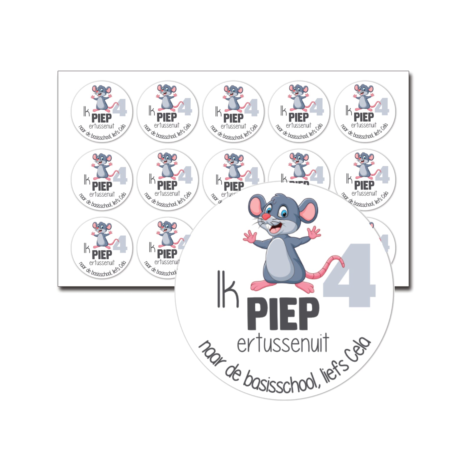 Traktatie stickers Ik piep er tussenuit met naam en leeftijd – 15 stuks per vel